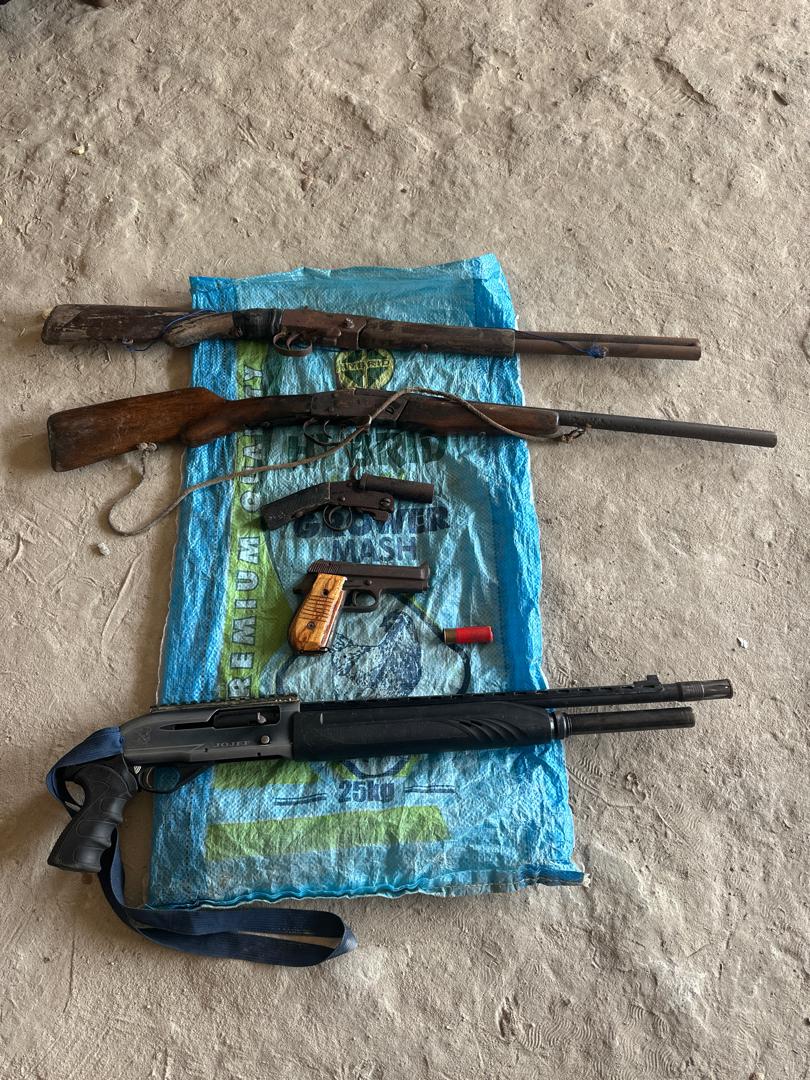 The suspects led the police to their hideout in Jeddo community where an automatic English pump action gun, one locally fabricated Beretta pistol, one locally made cut-to-size gun and a live cartridge were recovered.