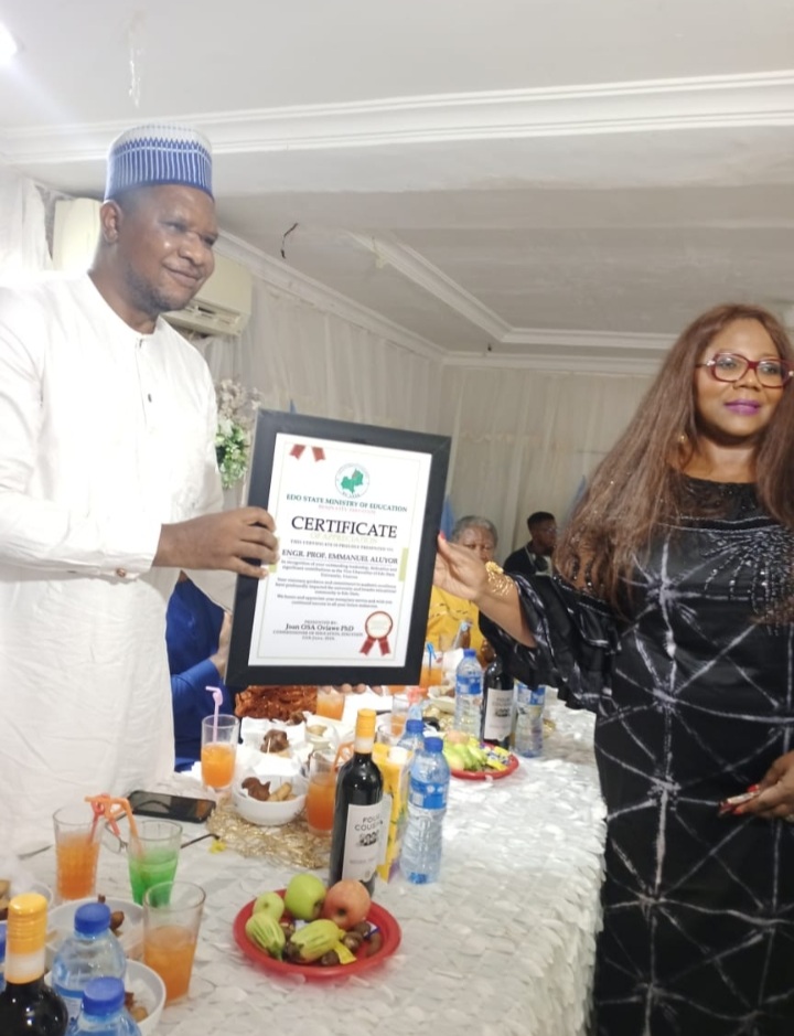 Dr. Oviawe  presented Prof. Aluyor with a certificate of appreciation, recognizing his outstanding contributions to the institution.