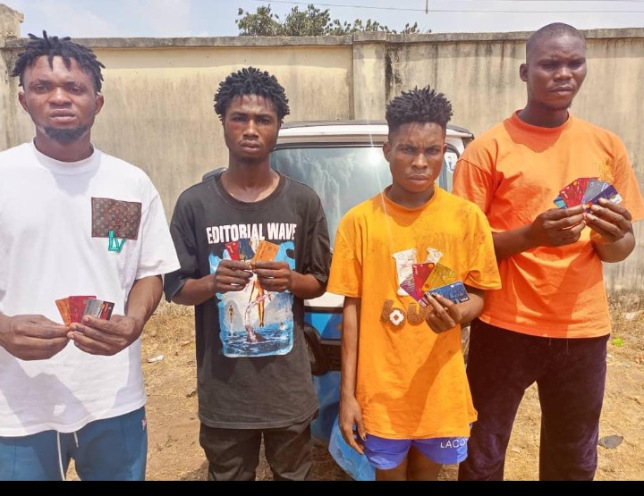The police spokesman also informed that the previous day, Sunday, January 22, On at about 0800hrs, operatives of Decoy Squad led by ASP Julius Robinson acting on a credible intelligence on a syndicate that specializes in defrauding unsuspecting victims of their hard earned money, the operatives stormed Ogwashi-Uku town and arrested the following suspects; (1) Allison Louis ‘m’ 27yrs a native of Numan LGA of Adamawa state, (2) Sunday David ‘m’ 22yrs a native of Oturkpo Benue state, (3) Peter Akagbai ‘m’ 20yrs from Umuokwe Quarters of Ogwashi-Uku and (4) Chibuzor Elumeze ‘m’ 23yrs from Ogbenta-Obi Quarters in Ogwashi-Uku. Exhibit recovered from the syndicate includes one (1) tricycle, fifteen (15) different bank ATM cards.