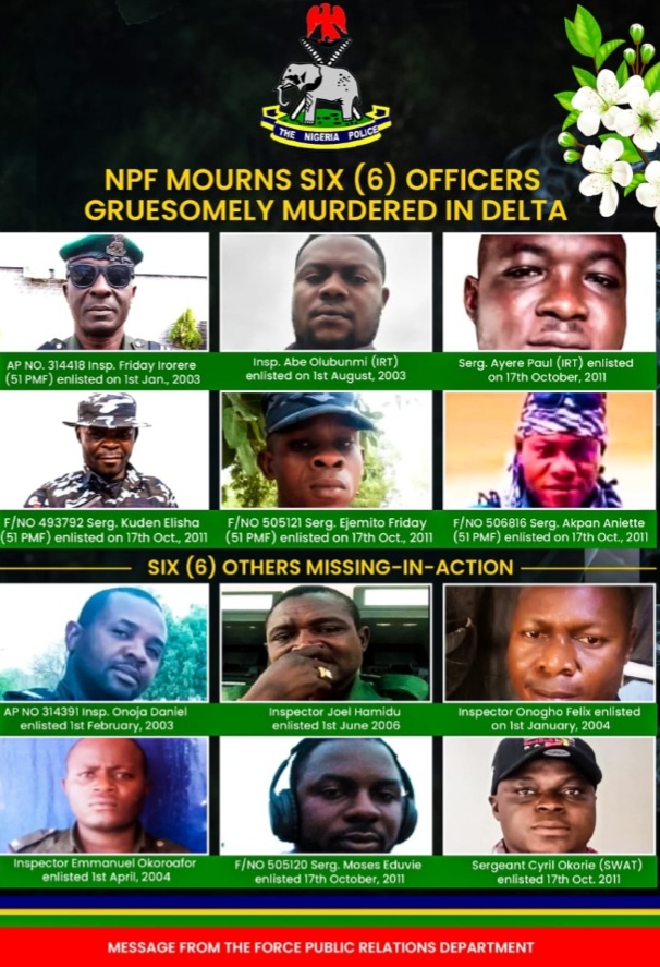 The Nigeria Police Force is profoundly saddened by the devastating loss of six (6) courageous officers in Delta State, who exhibited exceptional valour in the face of adversity. These brave officers tragically fell victim to a cowardly ambush by armed assailants while undertaking a mission to investigate the disappearance and rescue of three of their colleagues in the Ohoro Forest, Delta State, while six (6) others are currently missing-in-action. Our hearts extend to the families, friends, and colleagues of the fallen officers during this period of profound sorrow. We stand in solidarity with them, offering our deepest condolences and earnestly praying for the peaceful repose of the departed souls.