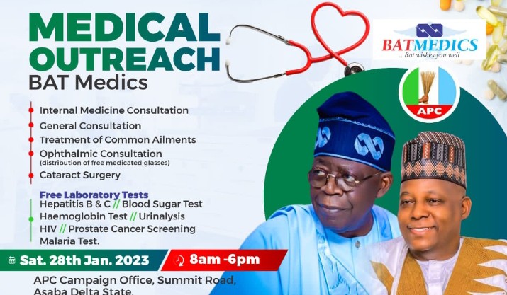 The Delta State APC Campaign Organization in Collaboration with the Bola Ahmed Tinubu Medical Outreach, BAT Medics, will be carrying out free medical services to the good people of Delta State on Saturday, the 28th of January, 2023.