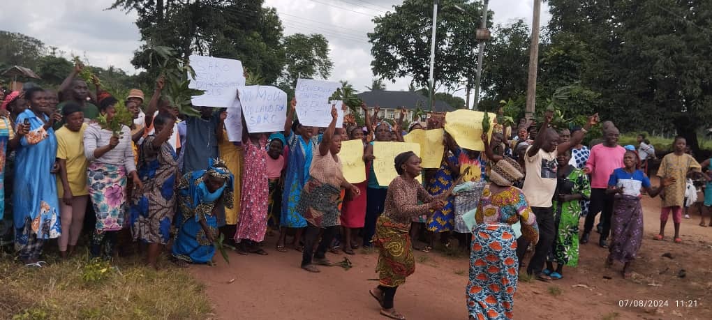 Protesting what they termed: continued oppression, harassment and intimidation by the Management of SARO Farms, the people carried placards of various inscriptions.