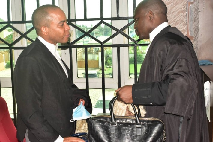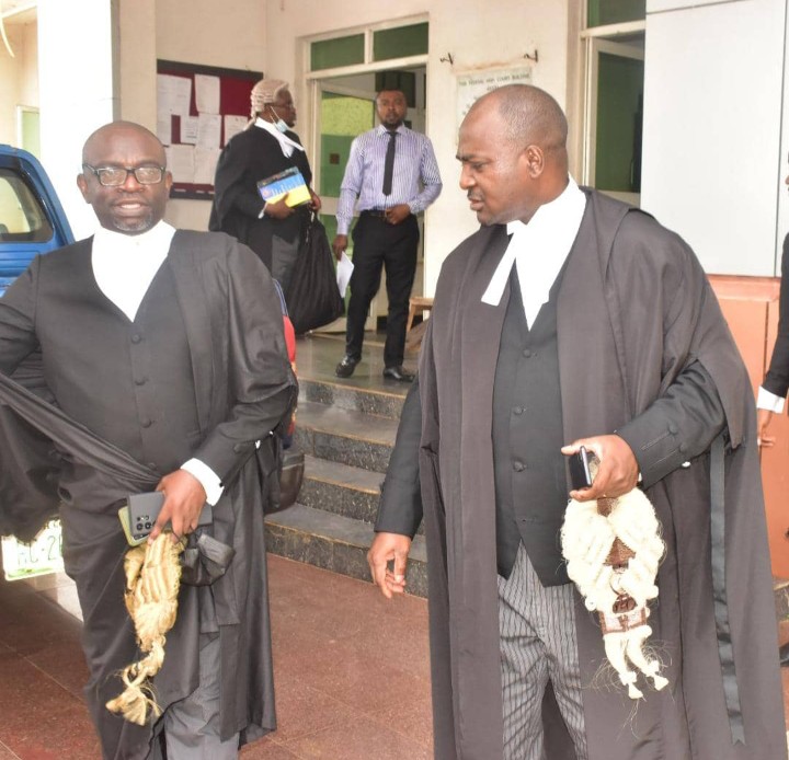 Delta Attorney general, Bozimo and Counsel to Delta State, Ohwovoriole at the Court premises