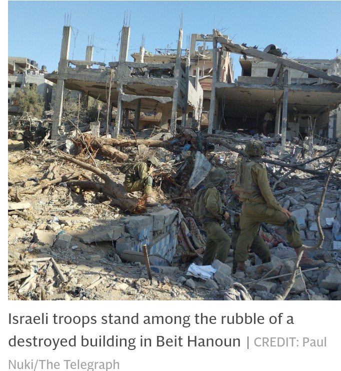 The Telegraph was driven in by open-top Humvee, whipping down a dirt track with a gunner poised above our heads. The city’s perimeter was a jagged mess of shattered homes. The convoy stopped at what would have been a communal area but now houses Israeli tanks, heavy armour and a platoon of troops.