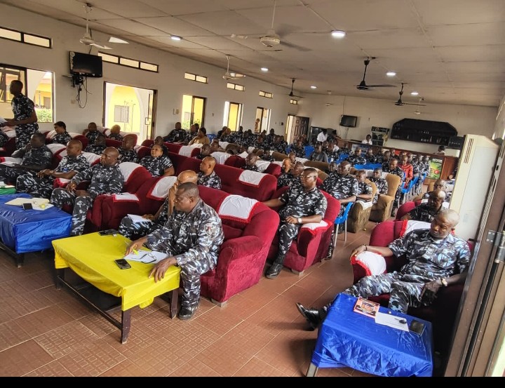 Officers and men receiving directives from CP Election Delta during a briefing at Police Headquarters, Asaba.