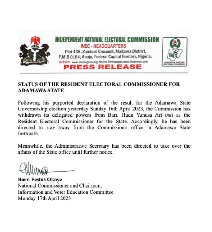A release issued by Barr Festus Okoye, National Commissioner and Chairman, Information and Voter Education Committee of INEC dated Monday, April 17, 2023 and titled, ‘Status of the Resident Electoral Commissioner for Adamawa State’, said , following the purported declaration of the results for Adamawa State Governorship election yesterday, Sunday, 16th April 2023, the Commission has withdrawn it’s delegated powers from Barr Hudu Yunusa Ari mini as the REC for the State.