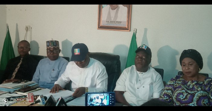 C), APC Edo State Chairman, Col. David Imuse retd; flanked on the (L), the State Publicity Secretary, Peter Enoserogbe Uwadiae Igbinigie Esq, and (R), the State Scribe, Lawrence Orkah, and the State Women Leader
