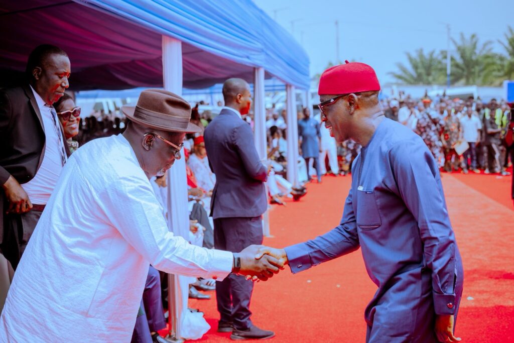 Governor Oborevwori greeting former Governor Ifeanyi Okowa at the arena of the event
