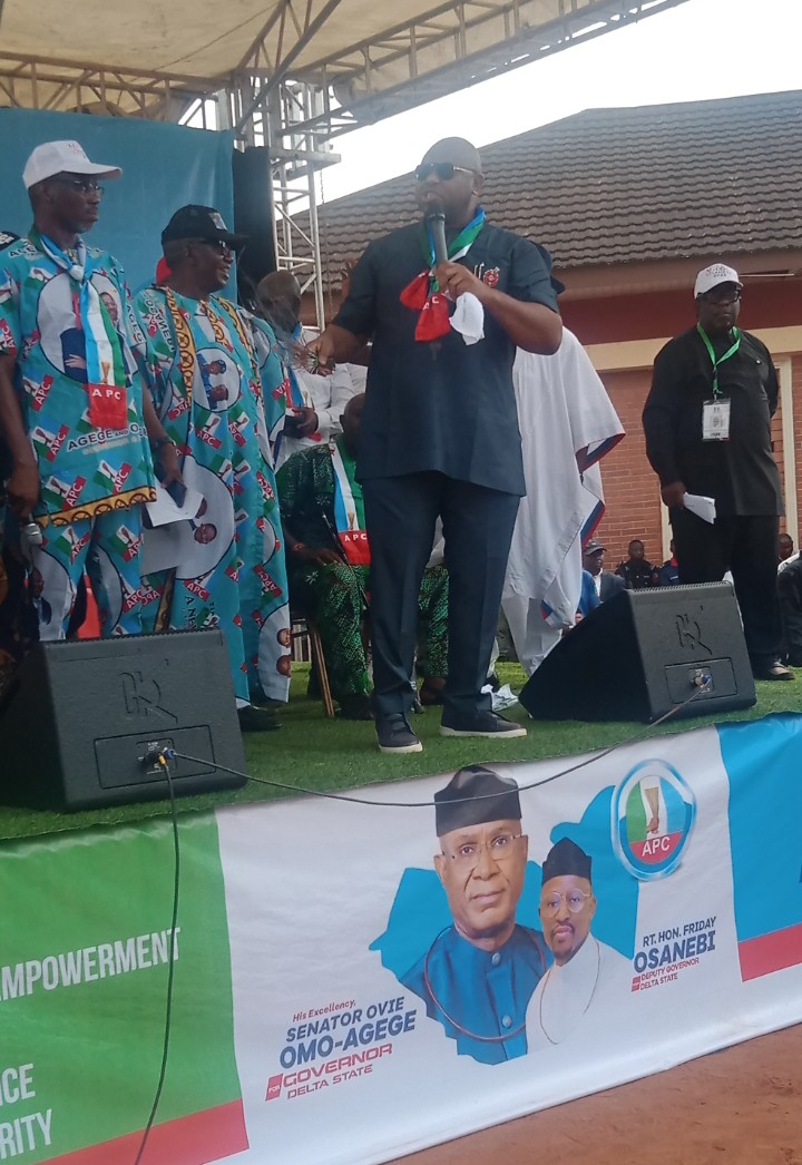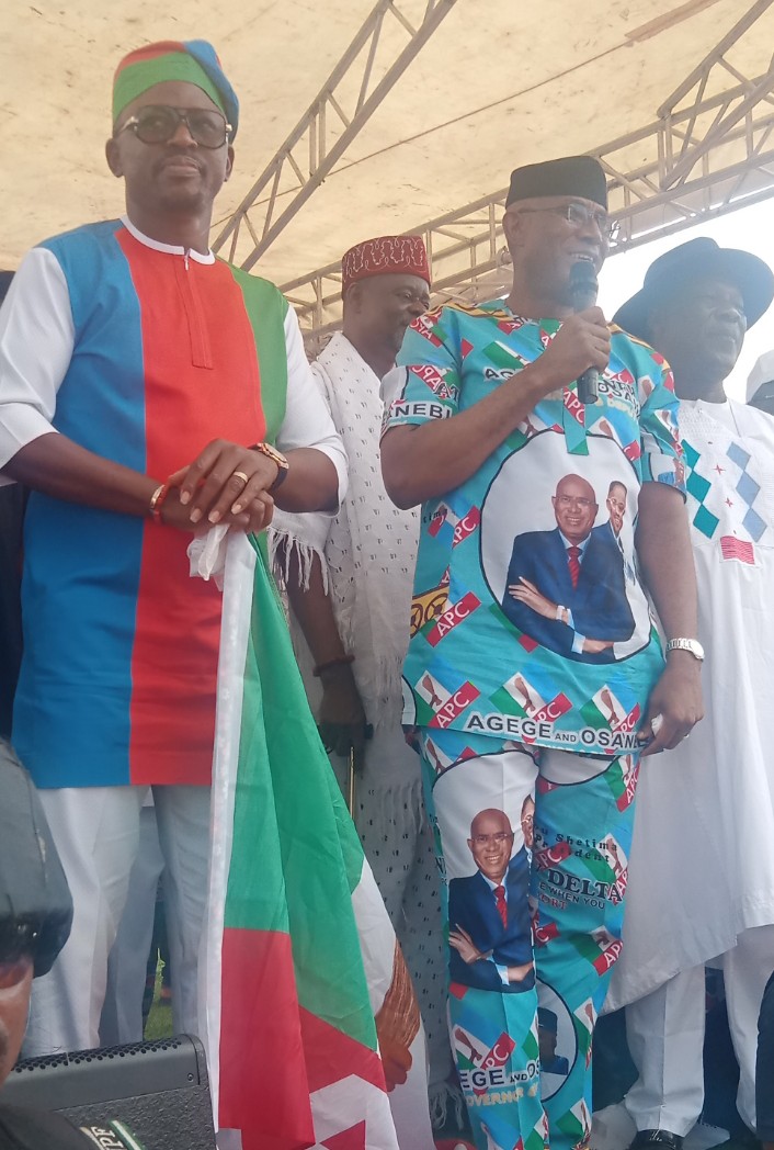 Earlier, former Speaker of Delta State House of Assembly and current Executive Director, Cabotage Services, NIMASA, Sir Victor Ochei, speaking on behalf of the people, rejected Okowa, the PDP gubernatorial candidate, Sheriff Oborevwori, and the PDP. He described Senator Omo-Agege as reliable, trustworthy and committed to the development of the people.
