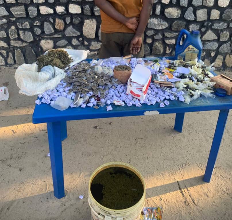 Exhibits recovered include the following: 3kg of Canadian Loud, 10kg of Indian Hemp, 24ltrs of soaked weed suspected to be Indian Hemp in dry gin (locally known as “monkey tail”), several sachets of Tramadol of various milligrams, and two (2) POS machines suspected of being used for drug sales.