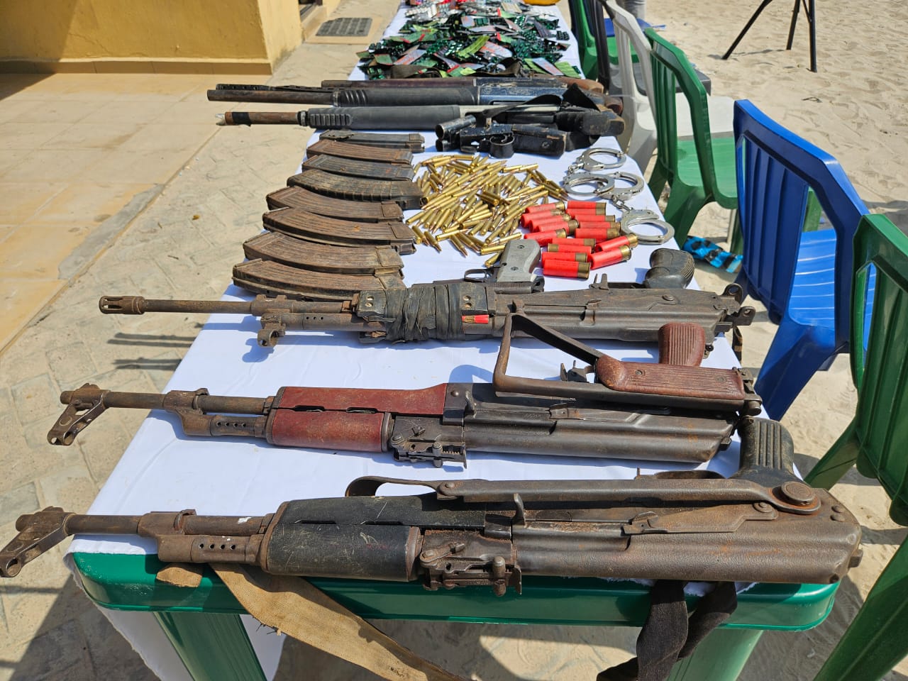 In Mosogar, Ethiope East LGA at a hideout  called Small Pastor Area, 2 AK 47 rifles, 1K2 rifle, 2 automatic pump action guns, 1 locally made cut-to-size gun, 5 AK 47 rifle magazines, 3 K2 rifle magazines,  101 K2 rifle live ammunition, 2 handcuffs  and 10 live cartridges  were recovered.