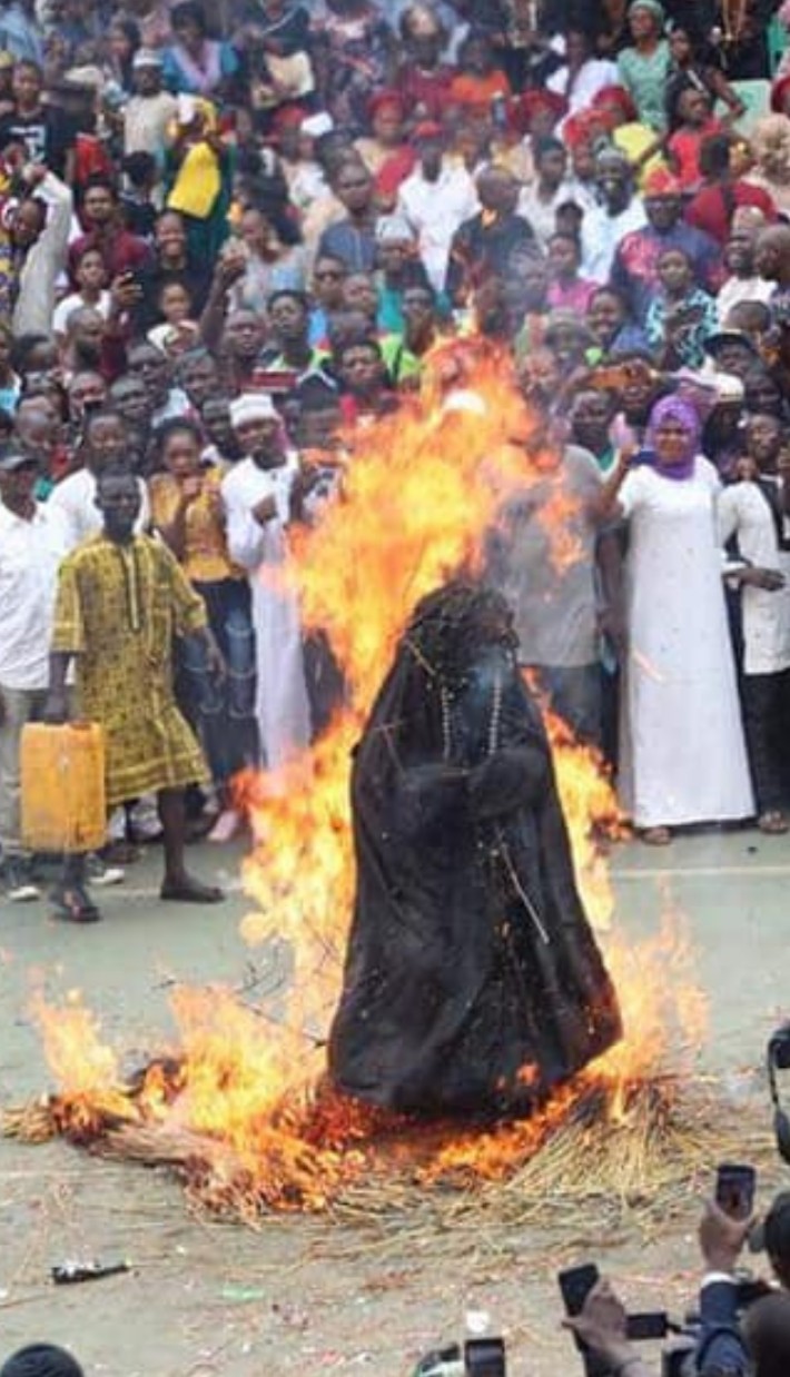 The consequences are clear and because he knows he has not been a true god and deified by the people, Fiam! Okowa jittered and and is trying to escape through the rear. But the gods have unleashed the spirits and the fire of deceit he lit to outsmart the people has engulfed him.